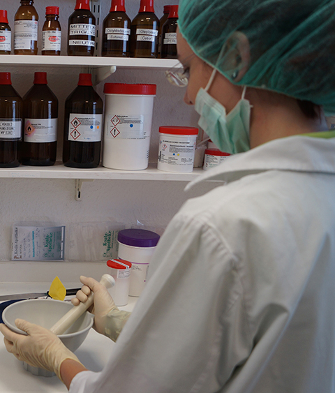 In unserem Labor stellen unsere Apothekerinnen und PTAs individuelle Arzneimittel her, sogenannte Rezepturen. Vorwiegend fertigen wir Cremes, Salben, Schüttelmixturen und Lösungen an, aber auch Kapseln, Zäpfchen und Augentropfen.