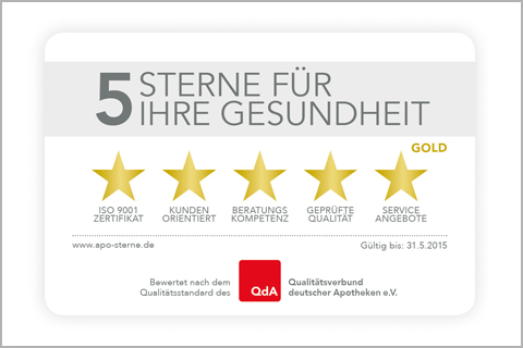Wir sind Mitglied im Qualitätsverbund deutscher Apotheken und haben 2013 die Fünf-Sterne-Auszeichnung erhalten.